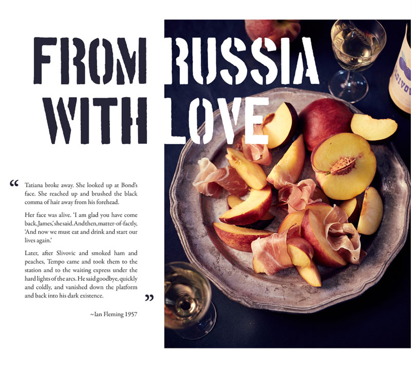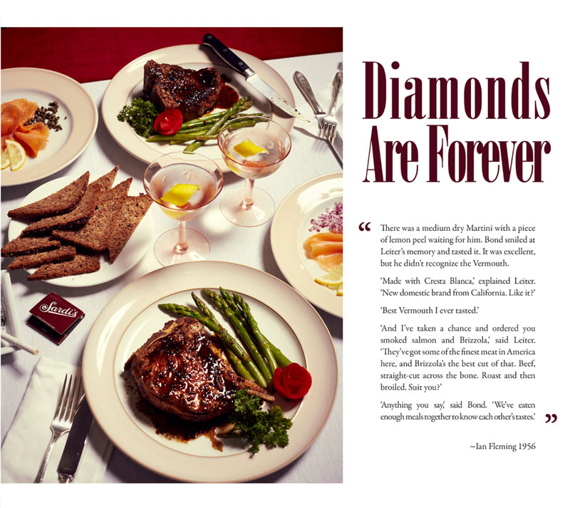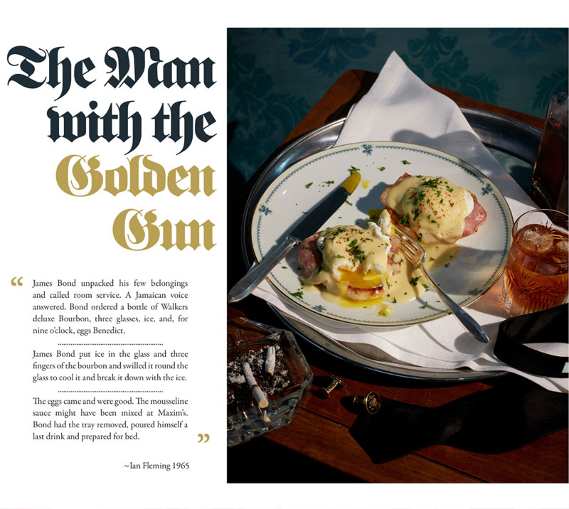 English photographer Henry Hargreaves had the inspiring idea to recreate Bond's meals in photos. He contacted food stylist Charloyye Omnés and together they meticulously brought these gourmet dinners from the page to real life. Since the books of James Bond mainly takes place during the 1950's, they had to go great lengths to find the proper attributes, such as salt strainers, glasses and cutlery.