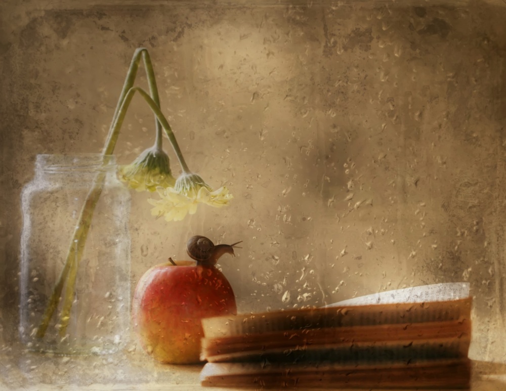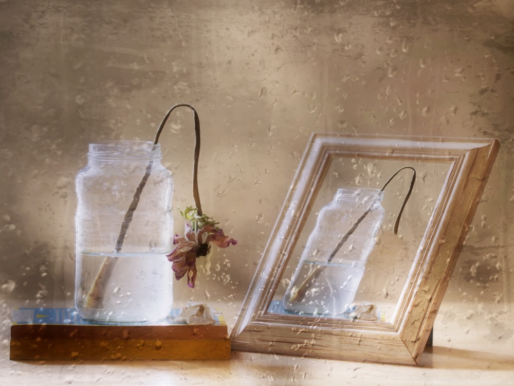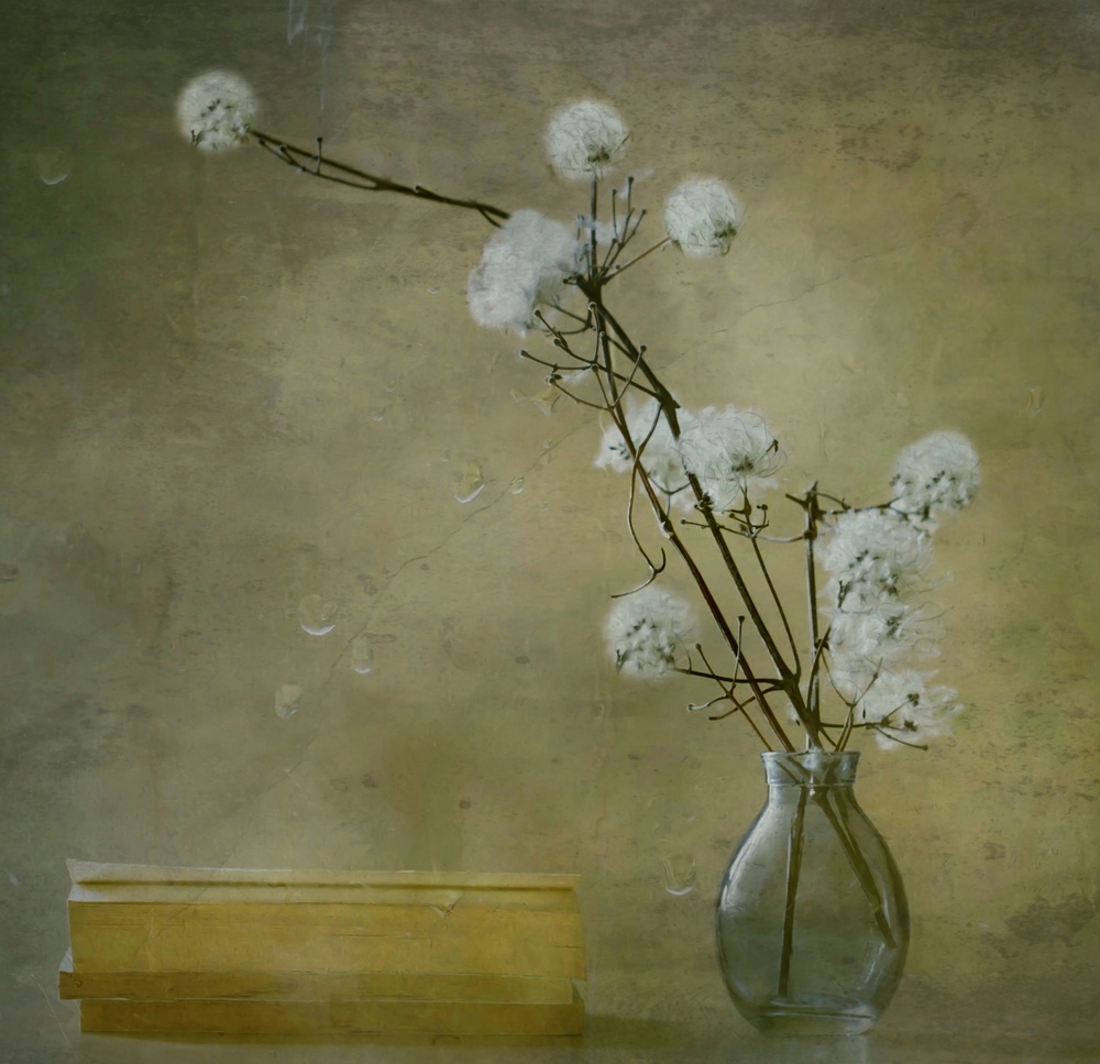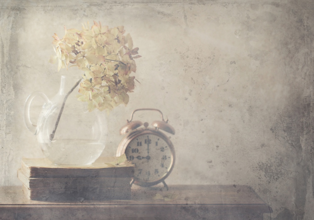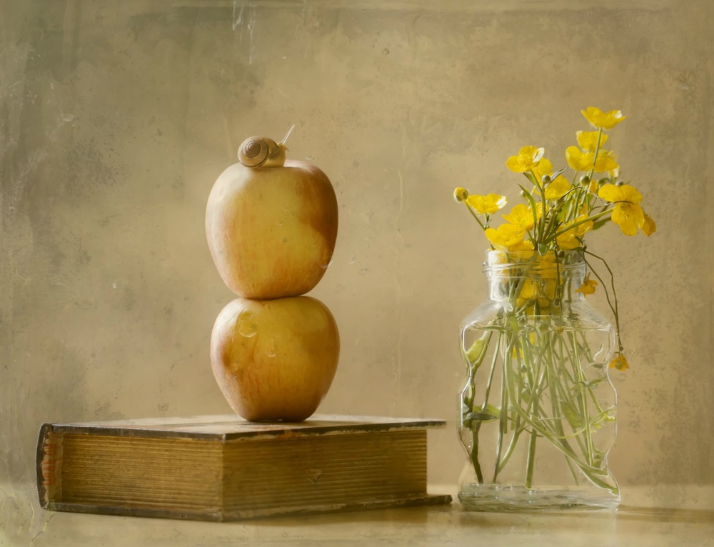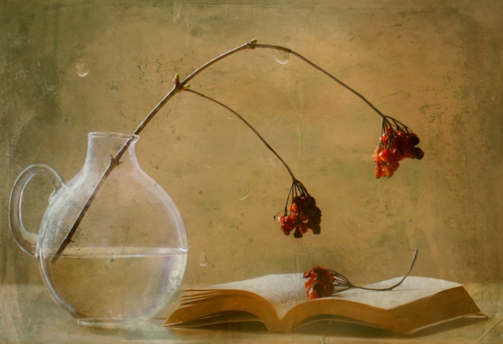 The background and the support must be in harmony with your items. It is not necessary to spend lots of money to create a beautiful still life. I often use jars, bottles, old books and also feel free to use what nature provides (branches, flowers, fruits …) Remember that making mistakes is a very good lesson to become a photographer.