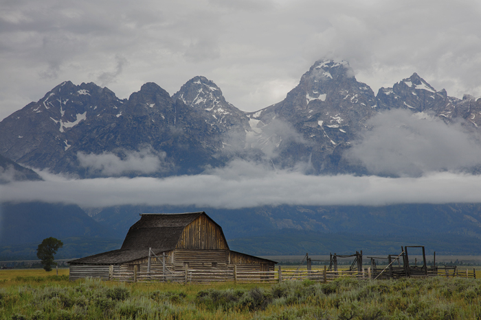 “Mormon Row” with the Grand Tetons in the background. This is in Jackson Hole, Wyoming.