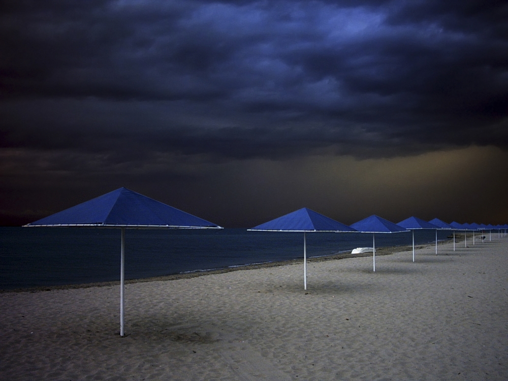 When I arrived at the beach, the color of the sky and the umbrellas got my attention. There was no one in sight, and the air had the sweet smell of rain and earth. It was obvious that it was raining in the distance on the open sea, and the wind was carrying the smell back to shore. The crashing sound of the waves served as the messenger of the fast-approaching storm. I had a simple camera with me, and I needed to find a good composition before it started raining.I aligned the umbrellas so they formed a straight line from the foreground to infinity, making sure that their bottom edges lined up along the horizon. That was a somewhat difficult task without a tripod, and it didn't help matters that there was not enough light. I noticed a few bricks lying around, so I quickly constructed a makeshift tripod out of them. Since it was a basic Instamatic camera, I shot three photos with the automatic setting.