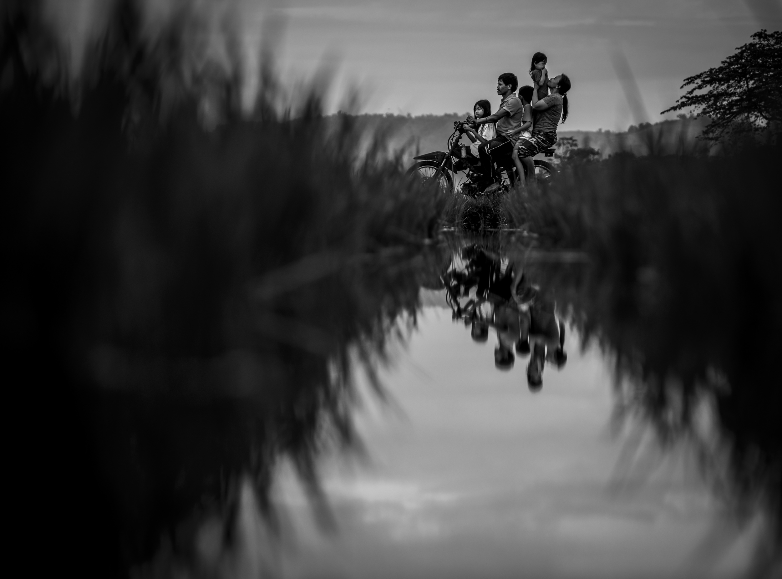 I took the photo while I drove along the riverside. It's wasn't easy to wait for the best moment. There were people cycling and I found taro leaves not far from this place. Suddenly I got an idea to draw the focus to the subject in the photo by blocking other parts of the image with a taro leaf. Shooting from that position with this framing made me feel happy. The position of the people in the picture almost came out perfectly well. It’s looks like a leaf cave.