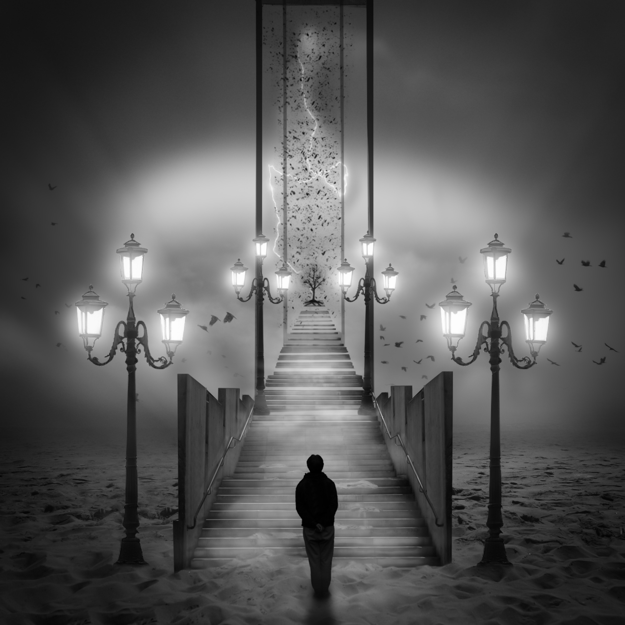 Digital image creation offers me the possibility to transform my visions into images. If I see an idea with my inner eye, I try to develop it creatively. To create emotions in my works, I like to use powerful black and white contrasts, with strong contrasts in the depiction of the size of objects and with an interesting lighting design. I often use objects such as clouds, birds, lamps and people as silhouettes, often represented very small.