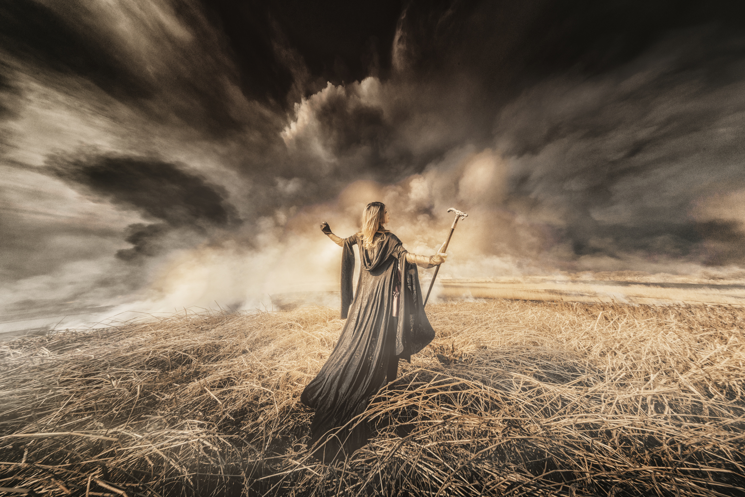 Before the shoot, I thought I was going to take a photo of a witch using magic. However, due to the direction of the wind and the rain the day before, the burning was poor and there was a lot of smoke. After a few shots, in this dramatic, story-like world, the model deviated from her original setting as a witch using magic, and in my eyes, she appeared to be playing a melody. And it seemed to be changing movements according to the winds of grief, craving, and smoke.