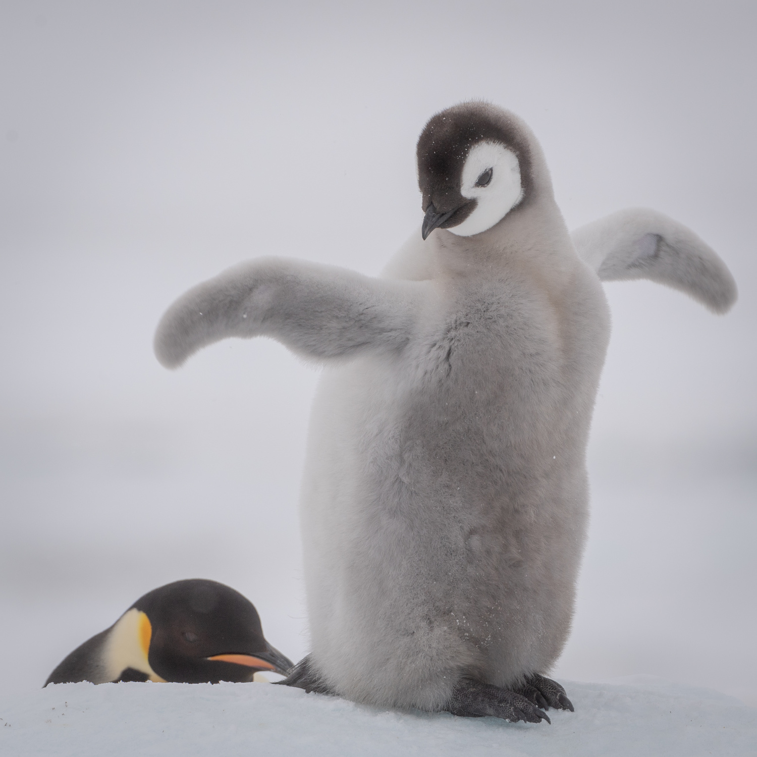 'No tickle please, Dad-Emperor penguin chick with dad behind'